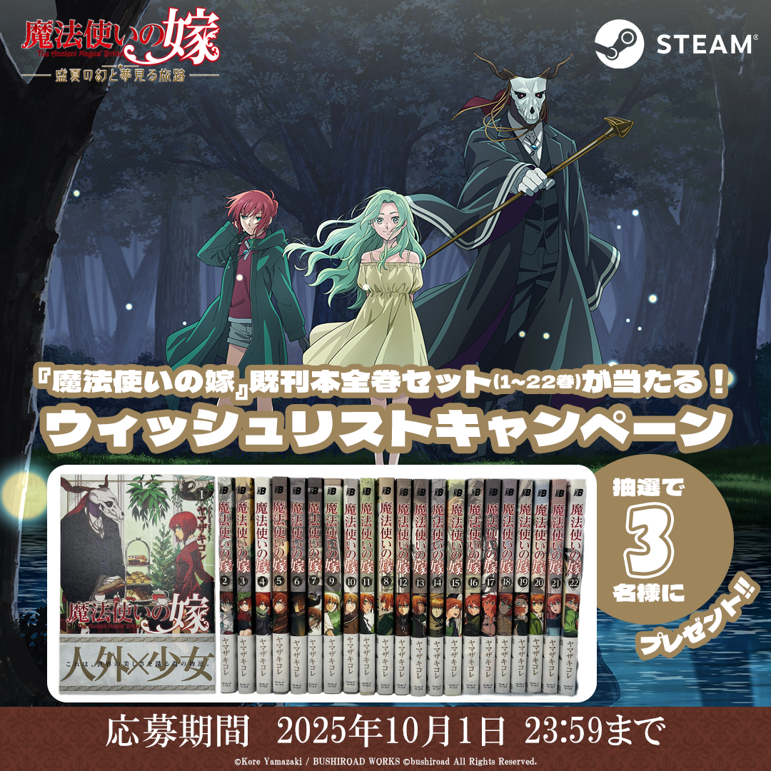 Steamストアにて『魔法使いの嫁 盛夏の幻と夢見る旅路』をウィッシュリストにご登録後、【応募方法】に沿ってご応募頂いた方の中から抽選で、『魔法使いの嫁』既刊本全巻セット(1~22巻)を3名様にプレゼントいたします。